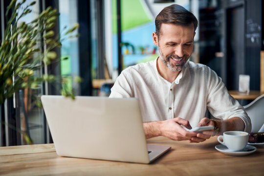 Man Checking Smartphone While Enjoying Coffee At Cafe Images