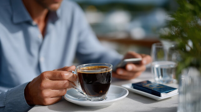 A man enjoying a cup of coffee while checking his smartphone, capturing a modern, casual outdoor lifestyle balanced between digital connection and personal moments.
