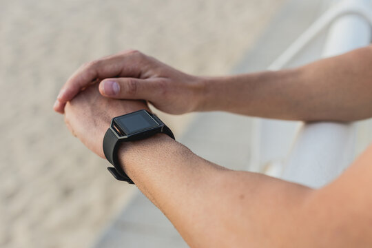 Close up shot of young sportsman using smartwatch to track him workout performance
