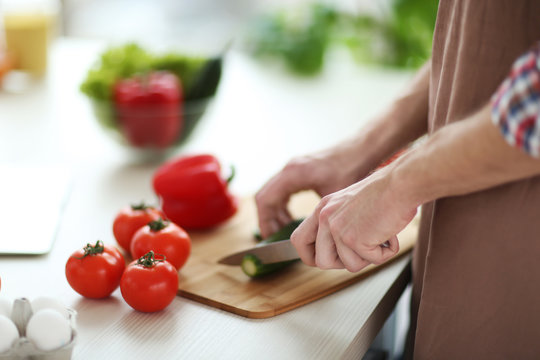 Caucasian man chopping cucumber in modern kitchen