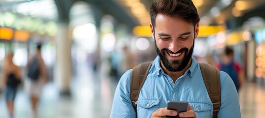 Cheerful bearded man using smartphone while waiting at bus station, with space for text