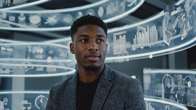 A young man contemplates data visualizations on a screen, showcasing technological advancements and insightful analysis.