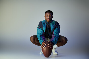 Serious male fashion model posing in squat pose and looking to the camera. Full-length studio shot. Isolated over white background. High quality photo