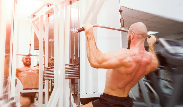 Bodybuilder doing pull ups workout for back muscles in gym