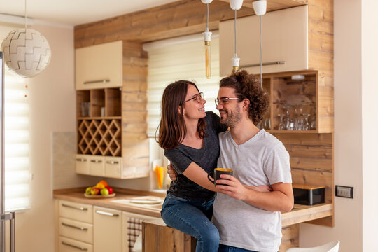 Beautiful happy young girl looking at her husband while sitting together in the kitchen and drinking juice and coffee before breakfast in pajamas.
