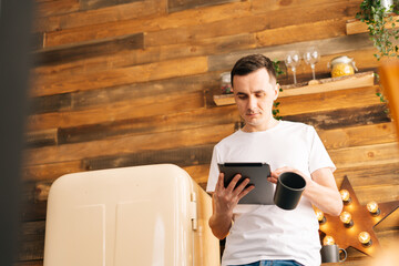 Handsome young man in casual clothes holding digital tablet and drinking coffee or tea in cozy kitchen room with wooden walls, looking at display, shooting from below.