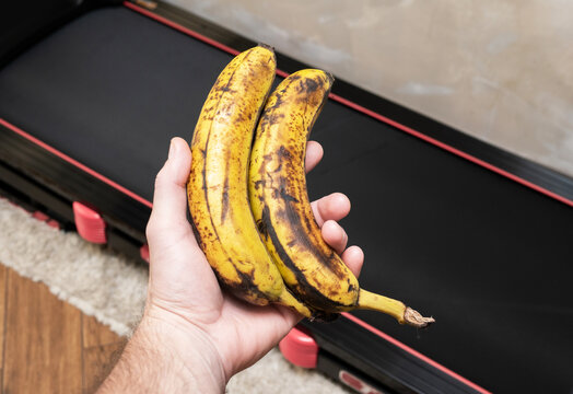 Bananas in a man’s hand against the background of a treadmill in a gym, weight loss concept