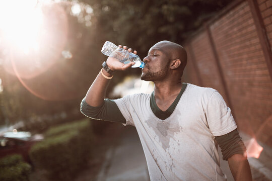 African American man drinking water after outdoor exercise session