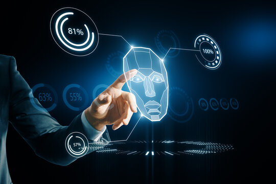 Business professional engaging with AI facial recognition interface on a digital device