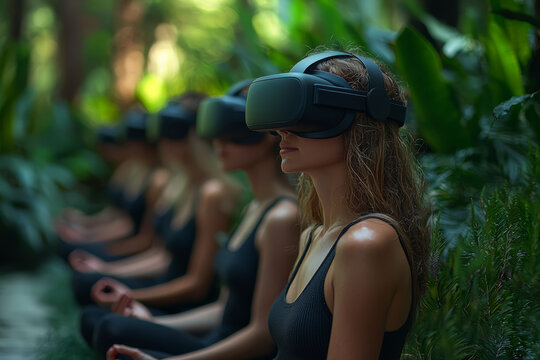A group of users engaging in a virtual reality meditation session, relaxing and exploring serene digital landscapes for mindfulness. Concept of VR wellness.