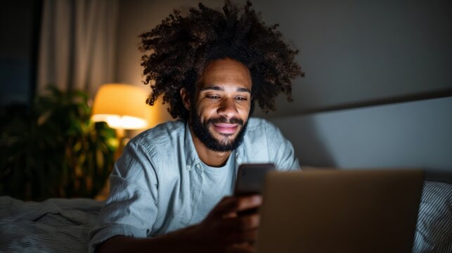 man is lying on a bed and looking at his cell phone at night.  Concept of relaxation and leisure, as the man is not engaged in any other activity
