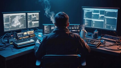 A man is deeply engaged in his work while wearing a headset, surrounded by illuminated screens that create a vibrant atmosphere in a dark control room setting.