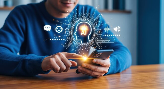 Man uses artificial intelligence chatbot on his smartphone, engaging with AI technology on his device