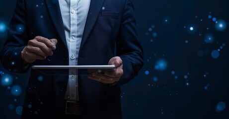 Entrepreneur engaging with futuristic technology on tablet. Business leader with digital device amidst abstract lights. Tech-savvy professional using touchscreen tablet with glowing effects.