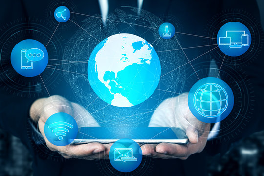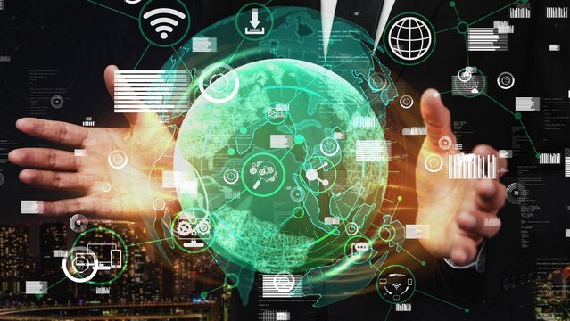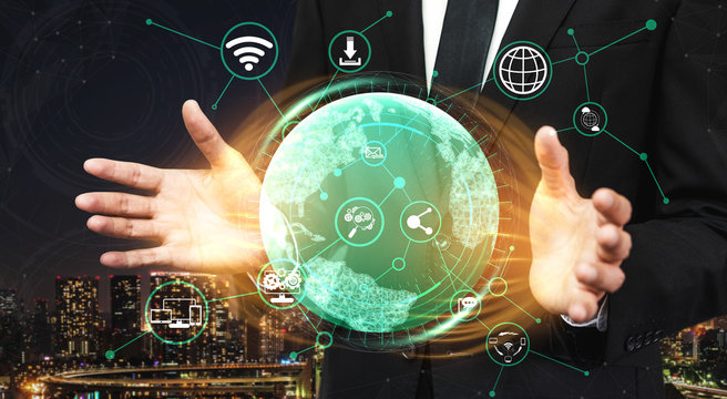 Caucasian businessman engaged with 6g technology in ultra connected world