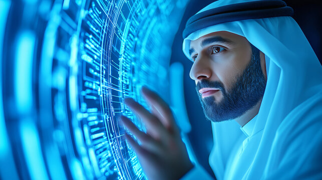Man Engaging with Advanced Digital Interface Displaying Intricate Data Network