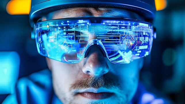A man wearing smart glasses and a cap appears engaged in a digital environment, surrounded by data visuals and technology.