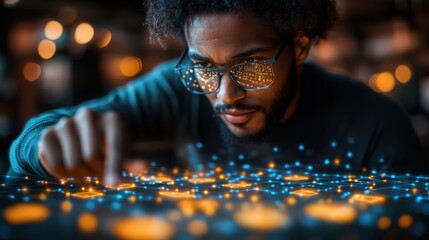 Man engaging with virtual interface using augmented reality glasses in modern workspace