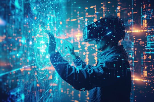 A man experiences virtual reality with enthusiasm, engaging in a digital search among abstract visuals. The image captures the essence of technological innovation and immersive interaction. Raster