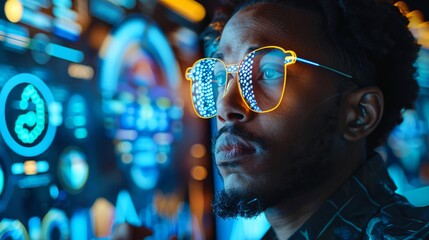 Immersed in Learning Man Engaging with Holographic Interface During Online Course, Futuristic Technology Surroundings