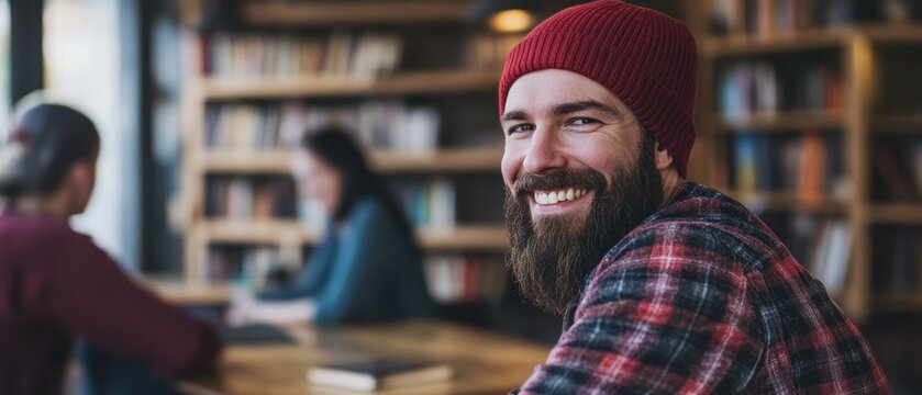 Man with beard and hat smiling in cozy coffee shop, enjoying leisure time while reading a book amidst friends engaged in conversation and study.