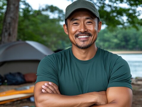 Strong smiles brighten the campsite as confident men enjoy nature on a sunny day