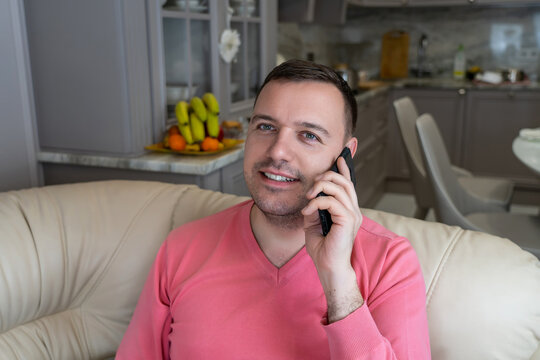 Portrait of happy man talking with mobile phone at home. Handsome millennial man sitting at kitchen on sofa with phone in hand and looking in camera indoors