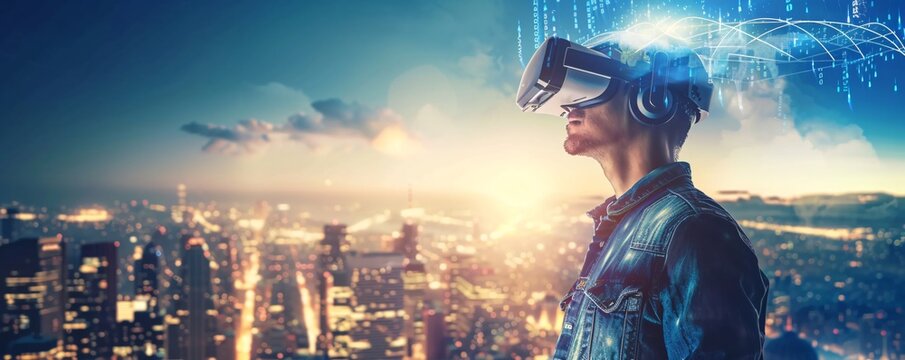 Man is immersed in the metaverse, experiencing virtual reality through vr glasses against a city skyline backdrop