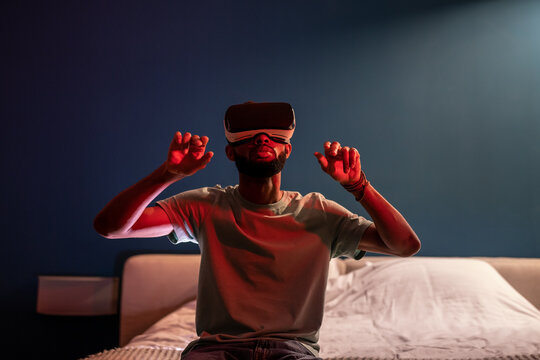 Man Experiencing Virtual Reality At Home In Modern Bedroom Images