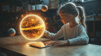 Tablet on classroom desk displays an augmented reality hologram with planets and cosmos, illustrating the use of AR technology for engaging and interactive learning experiences.