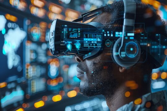 Close-up of an African-American man wearing futuristic blue glasses with digital overlays reflecting in the lenses