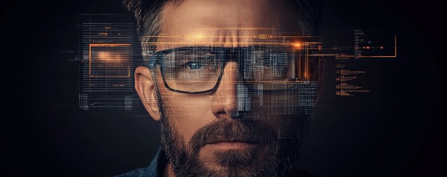 A focused man with glasses, surrounded by digital overlays, showcasing themes of technology, innovation, and data analysis.