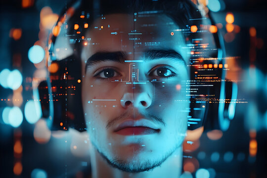 Detailed close-up of a young man's face with blue digital overlays across his vision, emphasizing futuristic tech