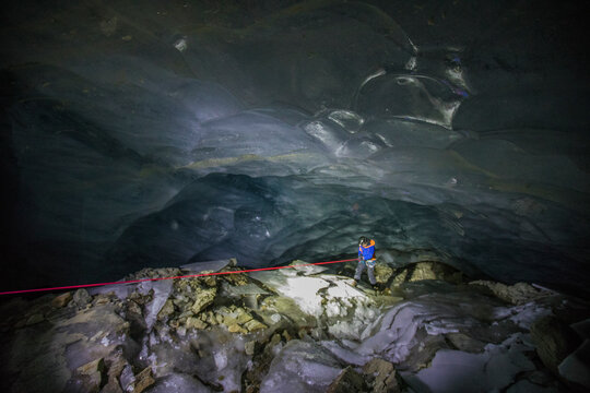 Cave explorer (Speleologist). Rare specialty concept. Man in the cave.