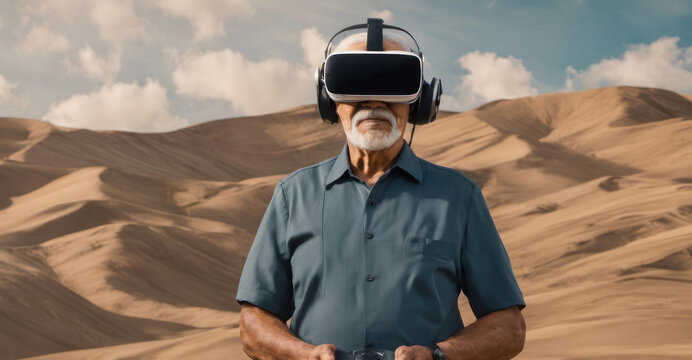 Senior man exploring virtual reality in technology setting