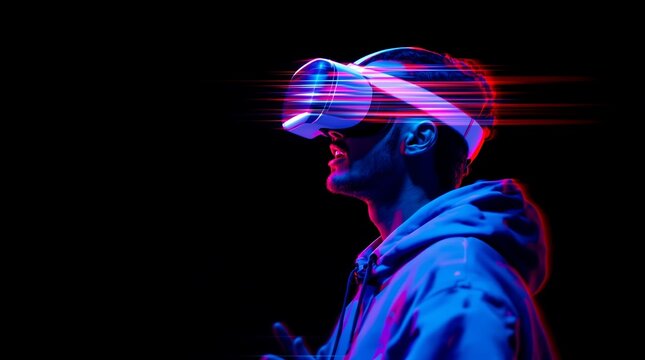 Exploring virtual reality man wearing vr headset future technology gaming metaverse experience simulation reality