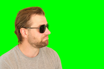 Surprised wow man over green background. Adult bearded guy in sunglasses gesturing on green screen chromakey. Handsome male looking pointed side to product placement isolated greenscreen. For Keying