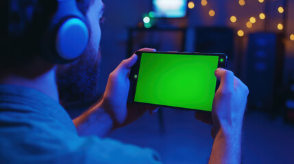 Hand holding mobile smartphone with blank green screen chroma key for mockup isolated on clean white background for business app display advertising design web presentation