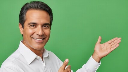 Confident middle-aged man presenting with open hand gesture against vibrant green background