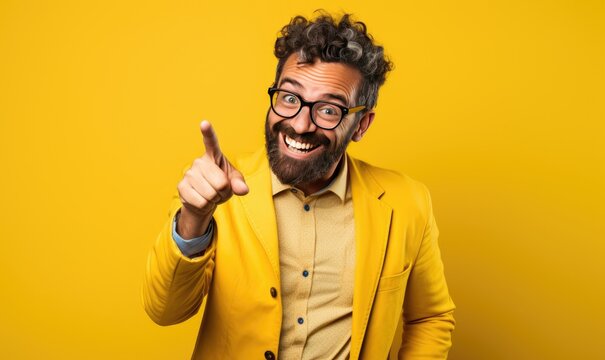 Smiling man with funny expression pointing at copy space, on yellow background. Generative AI