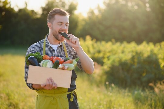 Hes come a long way from the start of season. Rearview shot of a young man holding a crate full of freshly picked produce on a farm.