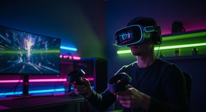 Young man immersed in virtual reality experience, enjoying a futuristic digital world.