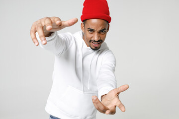 Cheerful young african american man 20s years old wearing basic casual streetwear hoodie standing reach out stretching hand looking camera isolated on white colour wall background, studio portrait.