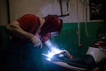 Portrait of a motorcycle rider posing with a black helmet on a white background.