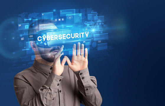 Businessman looking through Virtual Reality glasses, virtual security concept