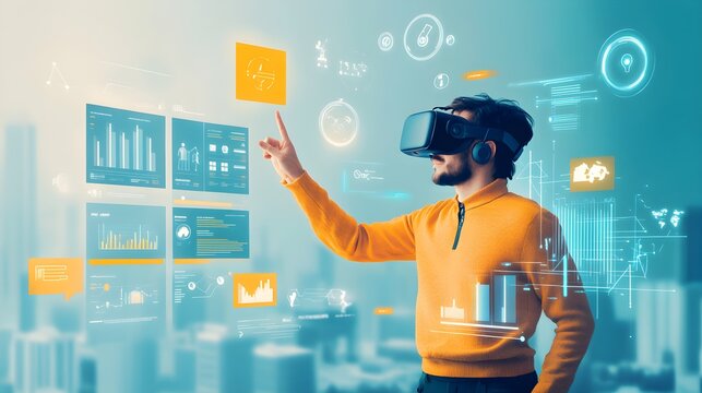 Man in virtual reality headset interacting with digital analytics display in modern workspace
