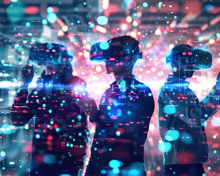 Immersive virtual reality experience with cybersecurity experts using VR glasses. They interact with digital data visualizations, showcasing advanced technology and innovation