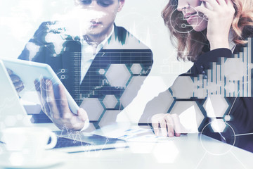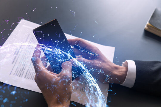 Handsome manager in casual wears, speaking phone, taking notes at office try to solve IT challenge from client. Double exposure. The concept of abstract technology.