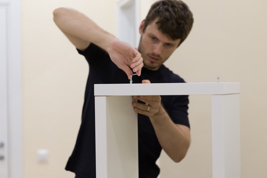 A male tool collects furniture color spanish walnut. Hands screw the furniture screw with a hexagonal wrench.