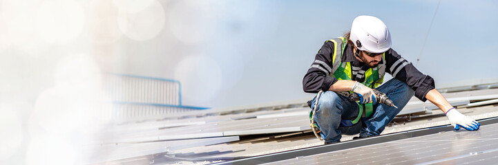 Web banner Male engineer installing or checking the working condition of solar panels on the roof or at the height of the factory for saving electricity was broken to use renewable energy from the sun